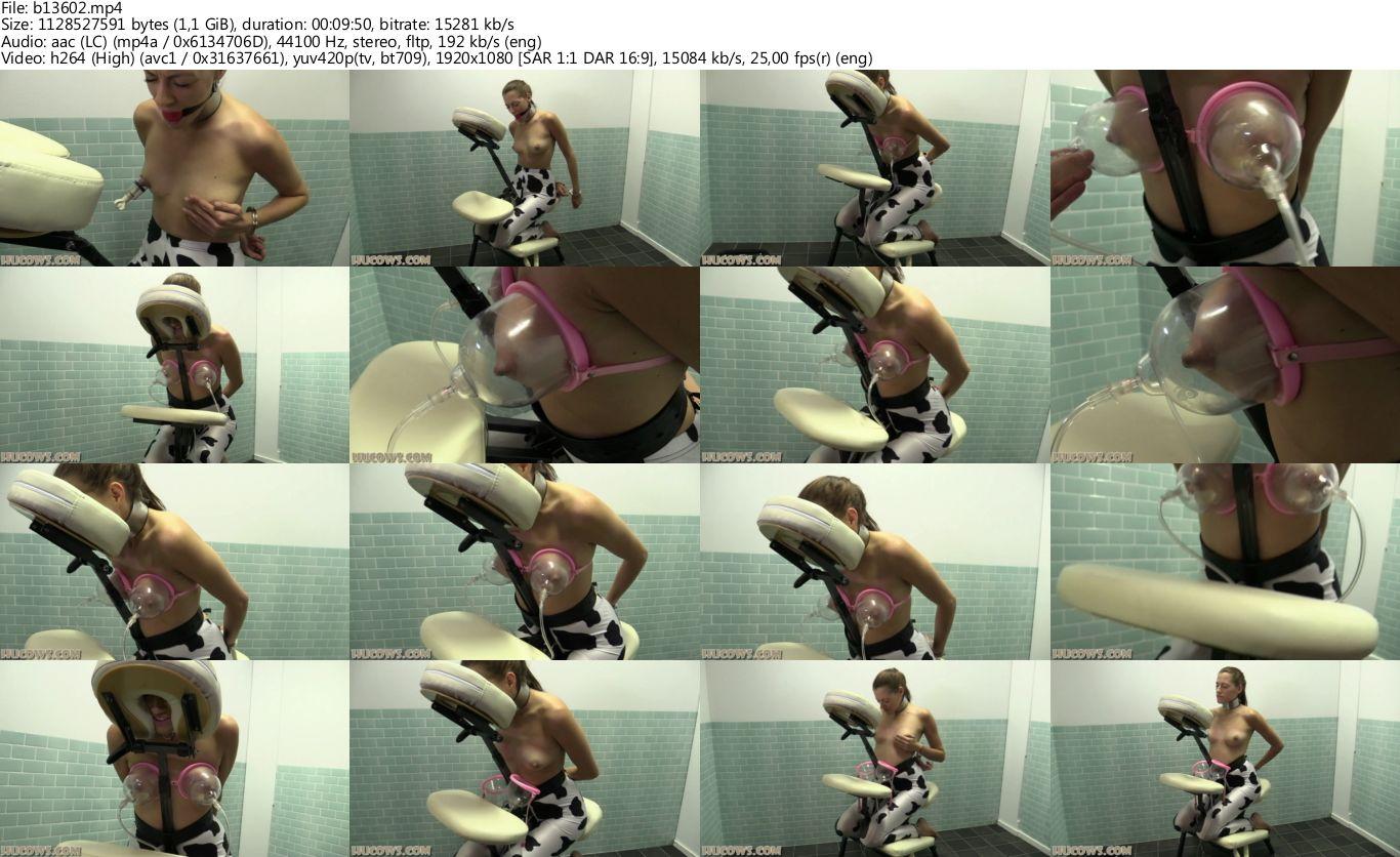 Britney is back! She had some adventures here at the farm already, but her udders are still quite small. Time to pump them using very high vacuum power! The special udder bra may look cute, but it is real torture when the full pressure is on! It's impossible to remove it by hand, that's how strong the vacuum is. Britney's udders are pumped to two, maybe three times their original size. But we are not all evil, we gave her a nice massage chair for her comfort! Britney is still a little panicky and scared during her sessions, let's hope she will get more docile soon!