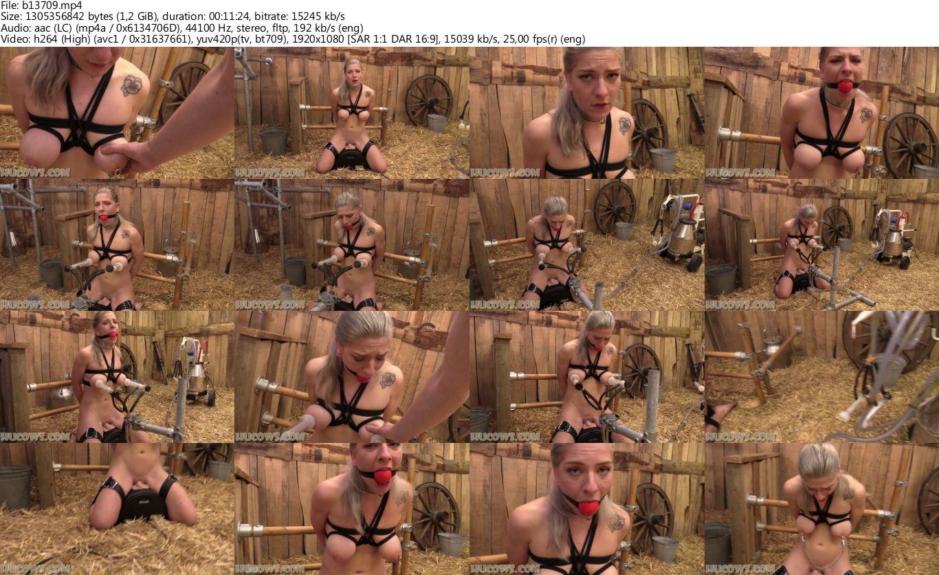 One of our best HuCows: Nora Sparkle! She is very obedient and docile, and she has very nice udders. The farmer has tied and clamped them in preparation for today's milking. He put Nora firmly on a Sybian, because sexual stimulation will increase hormone levels and thus milk production in the long run. Nora will be in for an interesting ride today, as she is highly orgasmic. At the same time, her nipples are ultra sensitive (especially after clamping), so she is probably very happy she will get vibrated on the most powerful vibrator in the world. Because the goat milker is not easy to deal with. Nora completely loses herself in the sensations: bondage, pumping, vibrating, her HuCow mind is getting overloaded! After some intense orgasms, the farmer returns to clamp her again. Very harsh, but necessary!