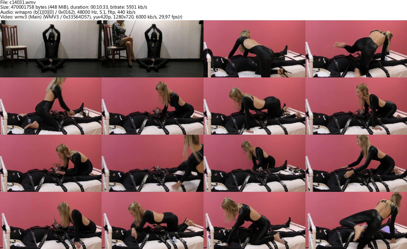 Carlin's slave is tied on a bed with segufix with his cock locked in a chastity cage, and she sits on him and teases his locked hock with the tip of her finger and paint brush.