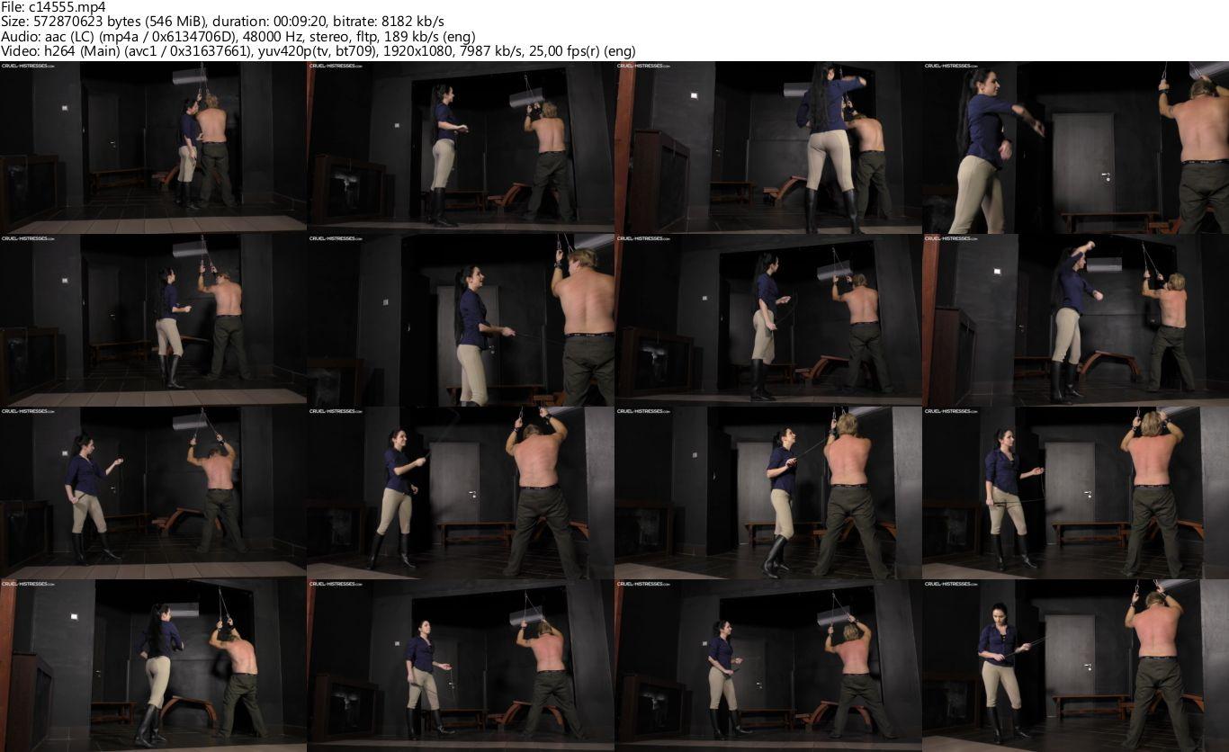 The slave imagines himself running out of the room, but he knows, that in reality, he has no chance to escape from Mistress Kittina and her painful whip. He is standing shirtless and tied and Mistress Kittina is working on his bare back with her whip, commenting his miserable life and enjoying her dominance.