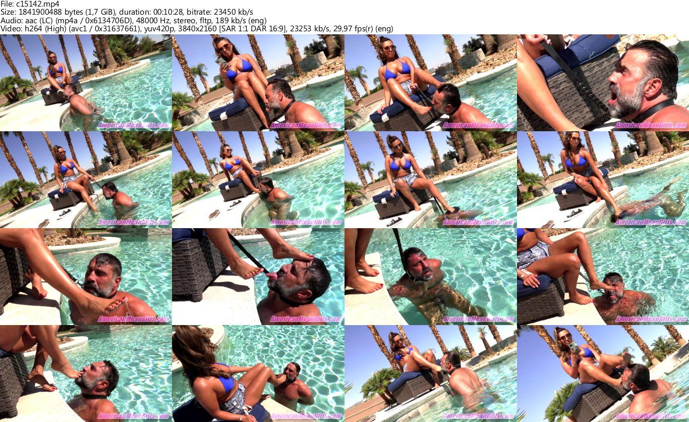 So I am basically just chilling in the pool at Mean Girl Manor, working on my fabulous tan. I have a slave handcuffed and leashed...and in the water at my feet so I can shove my feet into its open, waiting mouth whenever I feel like it. I have some fun casually shoving my feet down its throat, playing with its tonsins with my toes and trying to make it gag on my feet for my amusement haha. Every now and then I just put my little foot on top of its head and shove its ugly face underwater for as long as I like. Why?? Because I can! That's why! Its fun to play with slave's lives. But mostly I am just sliding my little size 5 feet on its tongue because a slave tongue feels good on my feet. And then I decide to shove BOH my feet into its mouth! and it BETTER fit them in- or else! At the end of the clip Princess Amber comes out to say hi and she had a surprise guest with her! One of the Brat Princesses decided to come to Mean Girl Manor to visit for the weekend apparently. She thought it was so funny that I am just out by the pool shoving my feet into the mouth of some loser that I have on a chain in the water...haha. But I explain that this is just kinda normal around here.