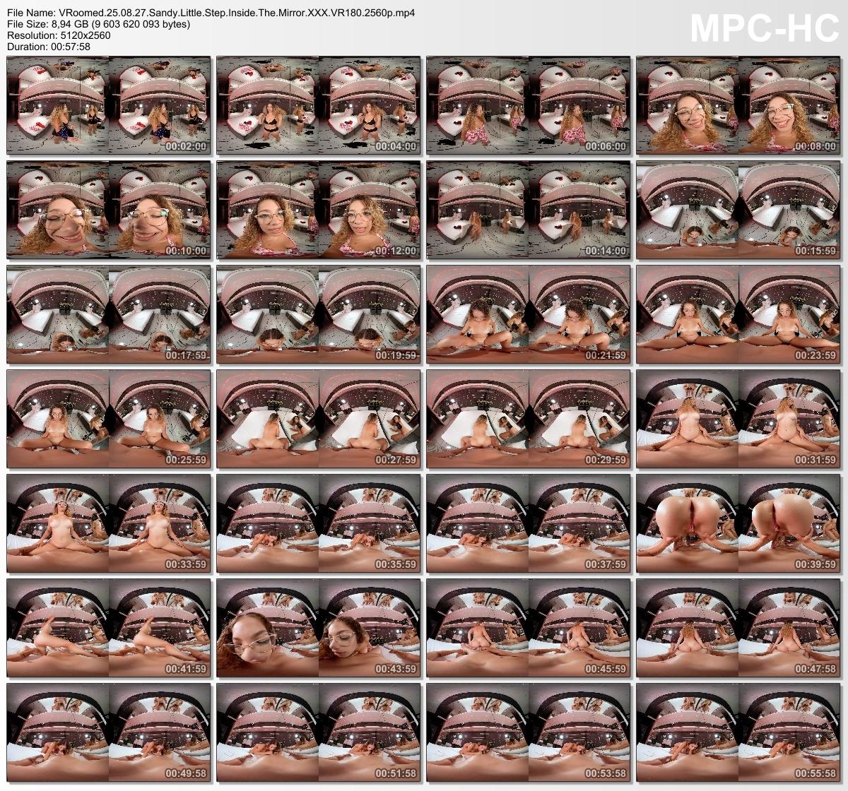 Your stepsis Sandy wants to try on some outfits for tonight, and she chose the room with the most mirrors. As she tried them on, she started undressing and asking you to look at her big ass. Her cute teen look with the glasses and high heels makes her a perfect fit for your cock. She takes the bra off and tries a dress, but you are already hard as a rock looking at her big tits. She notices the size of your cock and wants to take it all, so she strips naked. She gets on her knees and starts a blowjob, does a boobjob, then brings a chair so you can fuck her tight teen-pussy in missionary. She lies on the bed and begs for you to fuck her in doggy. After you get exhausted, it is time for her to ride you in cowgirl and reverse, get down on you with a sloppy blowjob and handjob, so you could cum in her mouth. She is a good stepsis.