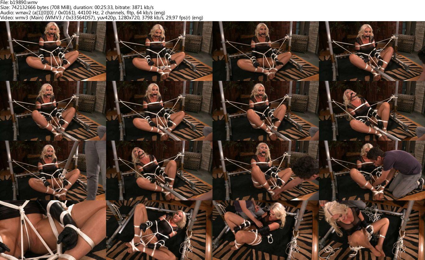 Jim likes to give demonstrations. In this clip after he’s gagged the blonde bombshell he tickles her feet. Her eyes get big but there is nothing she can do, she can’t move a muscle. You can hear the trepidation in her mmphs as he brings out the vibrator and turns it on high which it gently rests against her pussy. She’s going to have to work for her orgasms huh Jim? Off camera Jim is playing with something and all you can see are Gigi’s eyes getting bigger. She has no clue what he is going to do! She soon realizes that he has put the vibrator in a long tub so he can push it tightly against her hungry pussy. All she can do is drool all over herself and orgasm, you can see her body clench as she gets close. She can’t decide if she likes it or not! She wants to close her legs around the vibrator but it’s no use; he’s tied her legs open! She’s such a control freak that she just wants to hold it. Once she gets to a certain level she doesn’t care anymore and succumbs to the orgasm that is going to happen no matter she does. Then begins the begging, giggling and uncontrollable shaking. Her eyes roll back in her head as she cums and she says she can’t any more…. i think you can and will Gigi. So much drool, so much squealing, so much cumming. And oh so much sensitivity. Damn you and your long pole Jim Weathers! And your tickling fingers!! She just can’t take it!