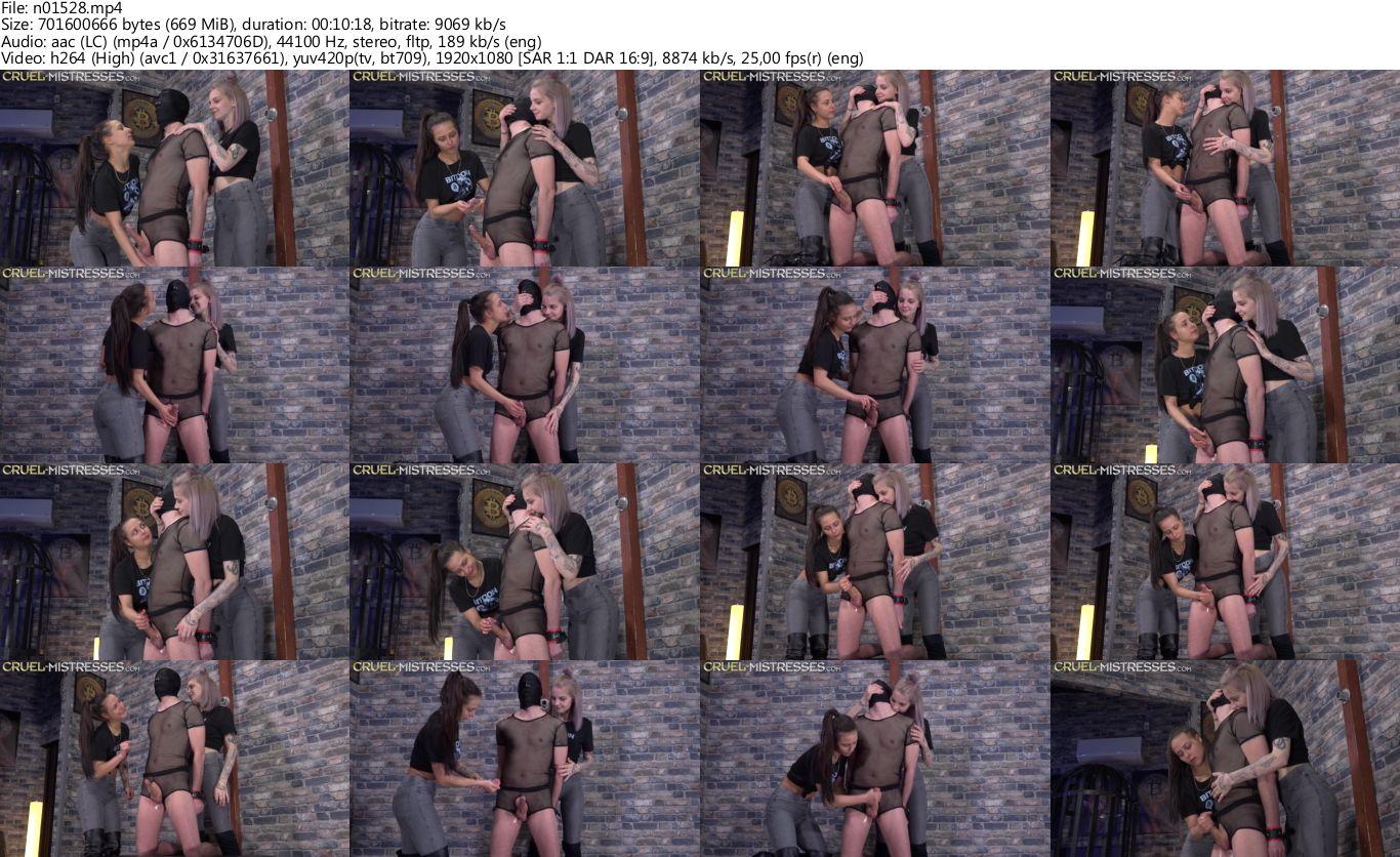 Mistress Laura, eager to share her expertise, demonstrated orgasm control with her masked slave. She stroked and teased him, bringing him to the edge before denying release, while Yvette stood behind, her palms covering his mouth. Occasionally, Yvette's hands wandered, caressing his body, adding to his torment and her own pleasure.